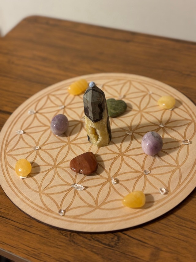 アバンダンスグリッド〜第1チャクラと第4チャクラ 無限の豊かさを受け取ることを意図して作ったクリスタルグリッドです。 豊かさを最大限に受け取るには第1チャクラと第4チャクラのバランスが取れていることが大切。チャクラを意識した色、ジャスパーの赤とアベンチュリンのグリーンを取り入れました。 グリッドボード:調和 繋がり ユートピアのフラワーオブライフ ジェネレーター:勇気 絆 親しみ 大地のセプタリアン ・仕事運アップ、感情のバランス、守るのレッドジャスパー ハート ・健康維持、ストレス緩和、心身サポートのグリーンアベンチュリン ハート ・3大ヒーリングストーンの一つ、第7チャクラと第4チャクラのエネルギーを最大に活性化のクンツアイト ・ポジティブエネルギー、明確さをもたらすオレンジカルサイト ・ネガティブを光に変えるクリアクオーツ